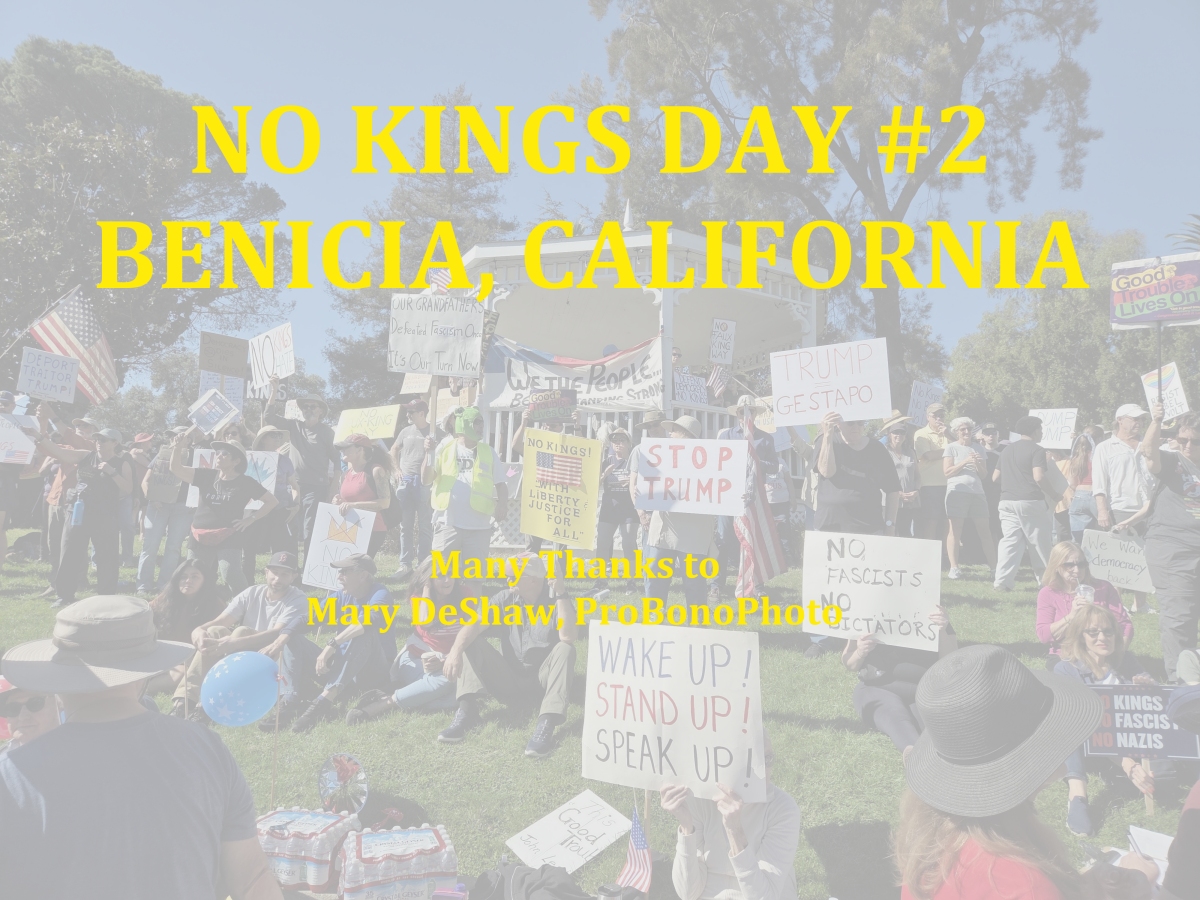 >> IN VALLEJO: Vallejo-Benicia INDIVISIBLE is holding a second NO KINGS Day of Action on Saturday, October 18, 10AM – 12PM, at Unity Plaza / JFK Library, 505 Santa Clara St. The event will include inspiring local speakers and live music as well as songs from our Resistance DJ. We will then march briefly through downtown Vallejo, ending around noon. The Vallejo event is listed with more detailed info on the Vallejo-Benicia Indivisible Facebook page (including a map).