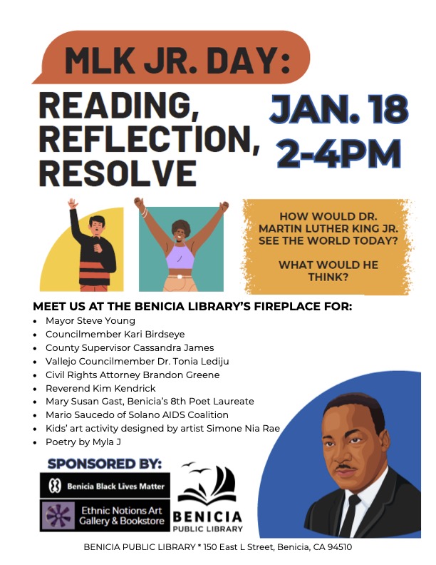 “We are thrilled to host this event with Benicia Black Lives Matter and create space for listening, learning, and connecting across generations,” said City Librarian, Jennifer Baker. “Dr. King challenged us not just to remember his words, but to act on them. This gathering invites the community to consider what that call to action looks like today, here in Benicia.”